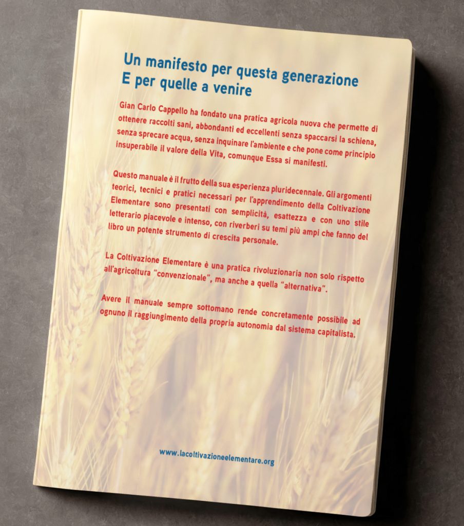 Un libro, quello sulla Coltivazione Elementare, scritto in maniera tanto appassionata quanto appassionante, a cominciare dalla prima parte di natura teorica, non a caso preponderante rispetto alle successive indicazioni operative. Non a caso perché se a livello operativo ci sono poche cose da fare, come peraltro suggerisce il sottotitolo del libro, per forza di cose ci sono poche cose da dire (anche in virtù delle tante illustrazioni). Un minimalismo operativo che si riduce addirittura al nulla se rapportato all'insieme delle tante pratiche convenzionali come aratura, rotazioni colturali, ecc., giacché nella Coltivazione Elementare non si deve fare nulla di tutto ciò. Ben altre (e ben poche) sono le cose che fanno davvero la differenza, perfino rispetto a quel concetto di agricoltura biologica che, come ci insegna Cappello nella parte teorica del libro, è solo in apparenza ecosostenibile, poiché di fatto alimenta (sia pure in buona fede) il business del grande capitale industriale, sempre intento ad affossare, o quantomeno a distorcere a proprio vantaggio, qualsivoglia progetto di (vera) ecosostenibiltà, essendo quest'ultima in contrasto con i suoi (loschi) interessi. Un libro dunque che non è catalogabile come mero manuale di agricoltura di sussistenza, tanto più che propugna un cambio di paradigma che mette in discussione il concetto stesso di agricoltura, anche questo spiegato in modo chiaro nella parte teorica: la stessa che fa di questo libro anche e soprattutto un manifesto politico. Un manifesto contro contro ogni idea ufficiale (e quindi distorta) di progresso e a favore di una nuova alleanza con la Natura.